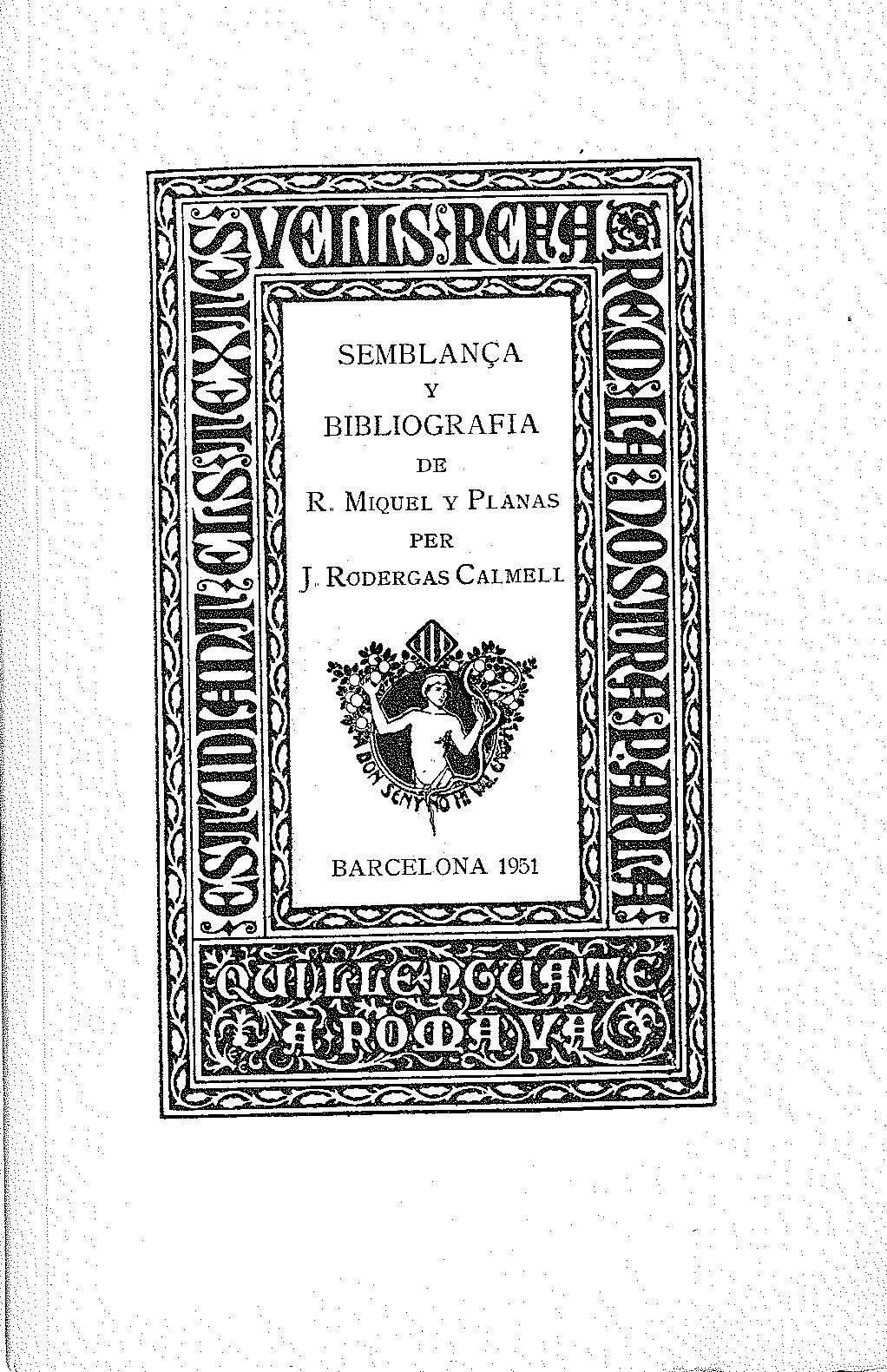 RODERGAS CALMELL, J.: Semblança y Bibliografia de Ramon Miquel y Planas per…; Barcelona, 1955, pp. 6.