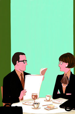 I ha un platet amb mantega per anar picant amb el ganivet petit que hi apareix, la bossa d’ella és sobre la taula perquè ja marxen o perquè acaben d’arribar o perquè hi ha lladres a prop.Ell porta un maletí i no està clar d’on penja o d’on s’aguanta o és molt alt i arriba fins la cadira que potser hi ha al costat, o no.