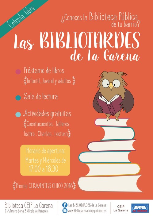 Bibliotardes: “Las Bibliotardes de La Garena: maratón de cuentacuentos por el Día de laBiblioteca.( https://www.dream-alcala.com/las-bibliotardes-de-la-garena-maraton-de-cuentacuentos-por-el-dia-de-la-biblioteca/ )