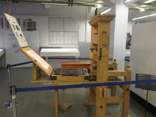 De tornada, amb autobús, a la Feria, i com la parada era davant la Biblioteca Nacional d’España, vaig decidir entrar a veure el Museu del Llibre que allà tenen. És gratis, vaig veure i gaudir d’unes quantes coses, algunes catalanes, vaig fer unes fotos de màquines, eines i llibres.