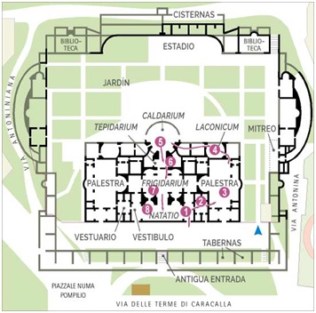 Biblio-termes: “Les termes eren considerades com un conjunt lúdic, d’oci i exercici on cultivar el cos i, amb el temps, el cervell també; amb diferents edificis: gimnasos, museus, jardins, estadis i biblioteques”.