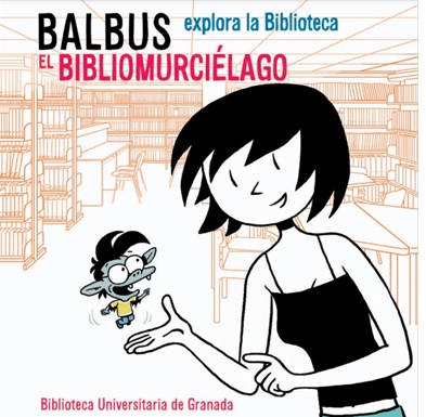 Bibliomurciélago:del llibre Balbus el Bibliomurciélago explora la biblioteca, amb guió d’Enrique Bonet i dibuixos de Chema García, Ed. Universidad de Granada 2021.https://biblioteca.ugr.es/pages/mis_primeros_pasos/balbusexploralabiblioteca/%21