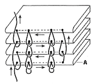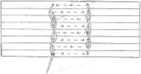 –Cadeneta a una filada: Cosit sense nervis que utilitza un sol fil per a tot el llibre, el qual recorre tot el llom del quadern entrant i sortint per cada forat del cosit i forma una baga que s´enllaça amb la baga del quadern precedent.