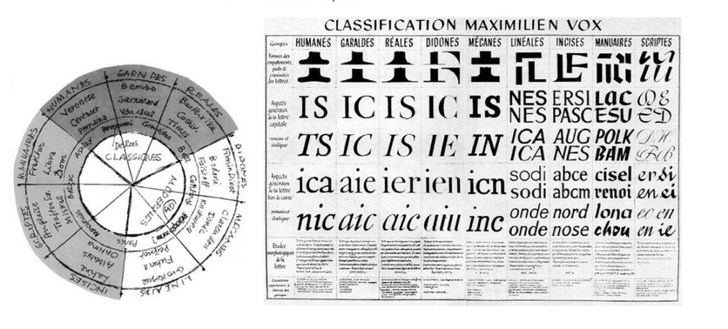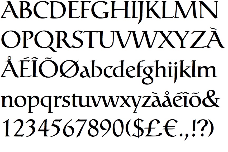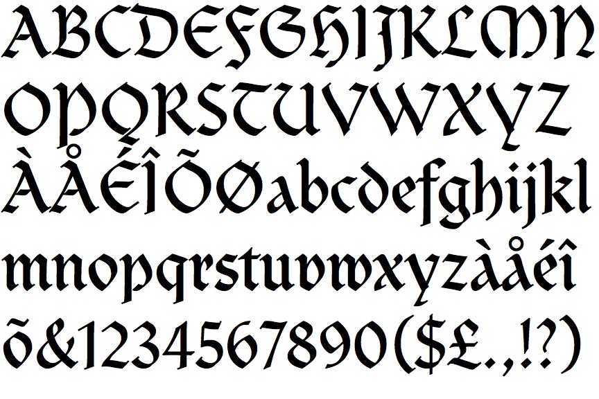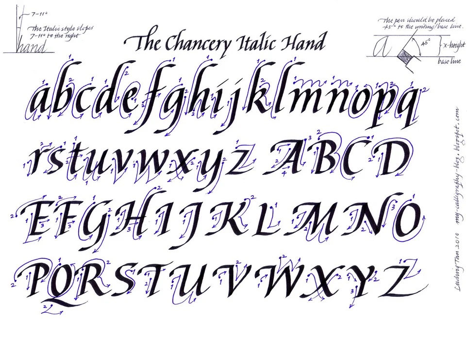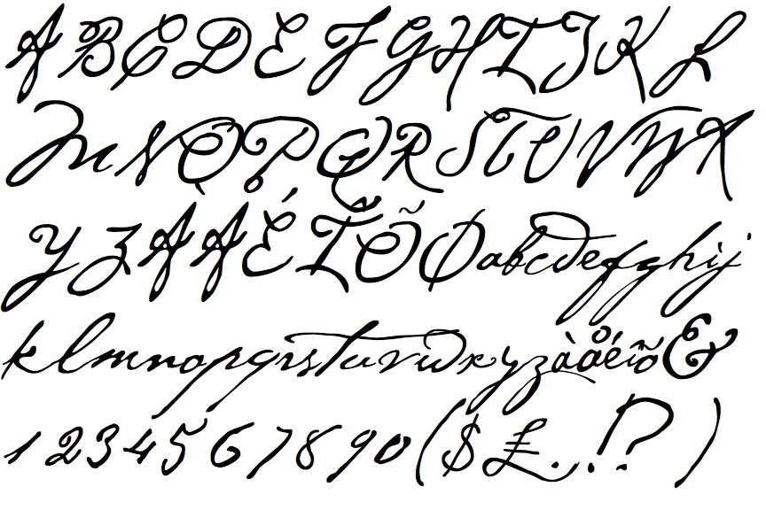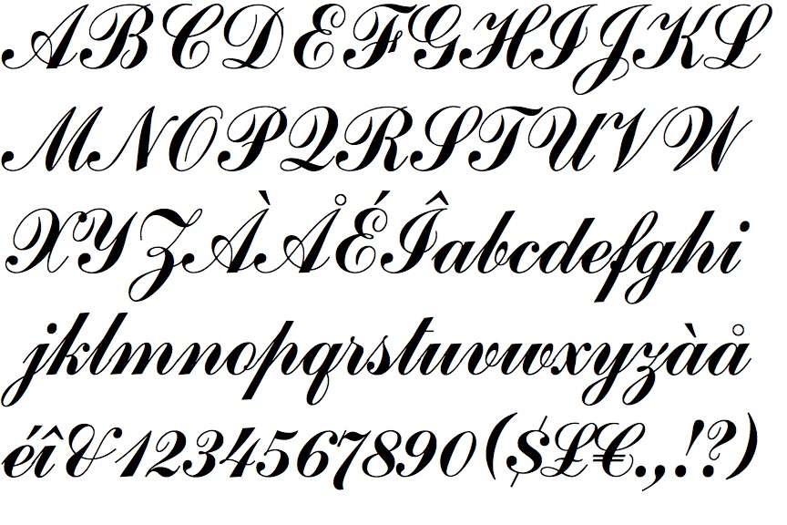 –Cursives angleses: Neixen de l’escriptura comuna feta amb ploma d’acer derivada del segle XIX. Són tipografies esveltes, amb línies fines i gruixudes pel traç de la ploma i molt ornamentades sobretot a les capitulars.