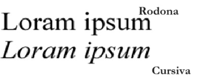 4. De la mateixa manera que el simple estrenyiment no converteix una font rodona a la seva condensada, les veritables cursives no són simplement una versió inclinada de la rodona, ja que els seus trets han d’haver estat dissenyats compensant els gruixos dels trets seguint l’eix vertical inclinat i el eix vertical real de la rodona. També es diu itàlica.
