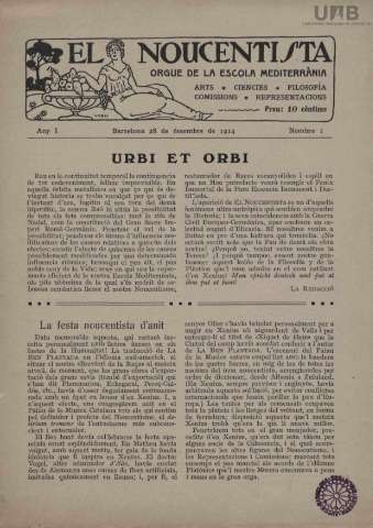 -Noucentista, El : Orgue de la Escola Mediterrània : arts, ciencies, filosofia, comissions, representacions. Barcelona : [s.n.], 1914 ([Barcelona] : Impr. Elzeviriana). El 28 de desembre d’aquell 1914 …, sortia el primer i únic exemplar d’una curiosa publicació, titulada El Noucentista, la responsabilitat de la qual sembla que cal atribuir a Ramon Miquel i Planas. El subtítol inicava: “Orgue de la Escola Mediterànnia. Arts. Ciències. Filosofia. Comissions. Representacions”. L capçalera estava ornamentada amb un dibuix de Vobis. Les vuit pàgines a dues columnes, format 233×149 mm, d’aquest número únic, imprès a la impremta “Elzeviriana” (Rambla de Catalunya, 12 i 14), estan dedicades a una sàtira del “noucentisme” predicat per Eugeni d’Ors, i demostra un notable enginy en el pastitx i una gran mordacitat en la crítica, que abasta les figures més destacades del moviment noucentista (Carner, Vallès, Riba, Sagarra, Bofill i Mates, etc.), així com les pintures, tan discutides aleshores, de Torres-Garcia al Palau de la Generalitat.