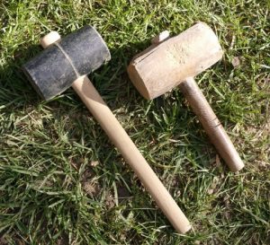 –Maça: Eina de percussió, generalment de fusta dura o de ferro, travessada per un mànec i afectant una forma semblant a la d’un martell.
