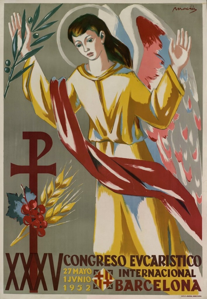 També va treballar com a il·lustrador. Una de les primeres referències, de data precoç, són la portada i els gravats que valoren les edicions de Dies verges de Joan Mínguez, i de El rector de Tours de Balzac, publicades als Quaderns Literaris de la Llibreria Catalònia, potser el 1934. Però sobretot vull destacar aquí Pau Macià pels cartells que també, quasi sempre, van estar dedicats a activitats i esdeveniments religiosos. El primer treball de què tinc notícia va ser premiat al concurs de cartells anunciadors d’una assemblea d’homes d’Acció Catòlica (1950), però no sé si es va arribar a imprimir. (2) L’any 1952 apareixen dos dels seus cartells més divulgats: el que va obtenir un tercer premi al segon concurs de cartells de l’Obra dels Homenatges a la Vellesa, que convocava la Caixa de Pensions (3) i, sobretot, el que va presentar al concurs de cartells del Congrés Eucarístic Internacional. El lligam amb l’Escola Massana, de la qual va ser alumne i professor, va fer que se li encarregués el cartell de l’exposició commemorativa del trentè aniversari de l’entitat el 1959. Però segurament l’èxit més vistós va ser el tercer premi obtingut en un concurs convocat per la Unesco el 1962, tot i que no crec que el seu projecte arribés a ser imprès. La convocatòria demanava mitjans de propaganda que afavorissin la “comprensió” i la “cooperació” entre tots els pobles del món. Segons llegim a la premsa del moment, “Maciá Pons recurre al símbolo de la paloma que se posa sobre dos manos juntas y abiertas; el conjunto va rodeado de círculos de colores que evocan el arco iris.” (12) El primer premi de 500 dòlars va ser concedit “ex aequo” a l’iranià Morteza Tabrizian i el polonès Stanislaw Zagorski, mentre que el cartellista de Les Borges, que s’hi va inscriure amb el nom en català, Pau Macià Pons, va rebre un premi de 300 dòlars.