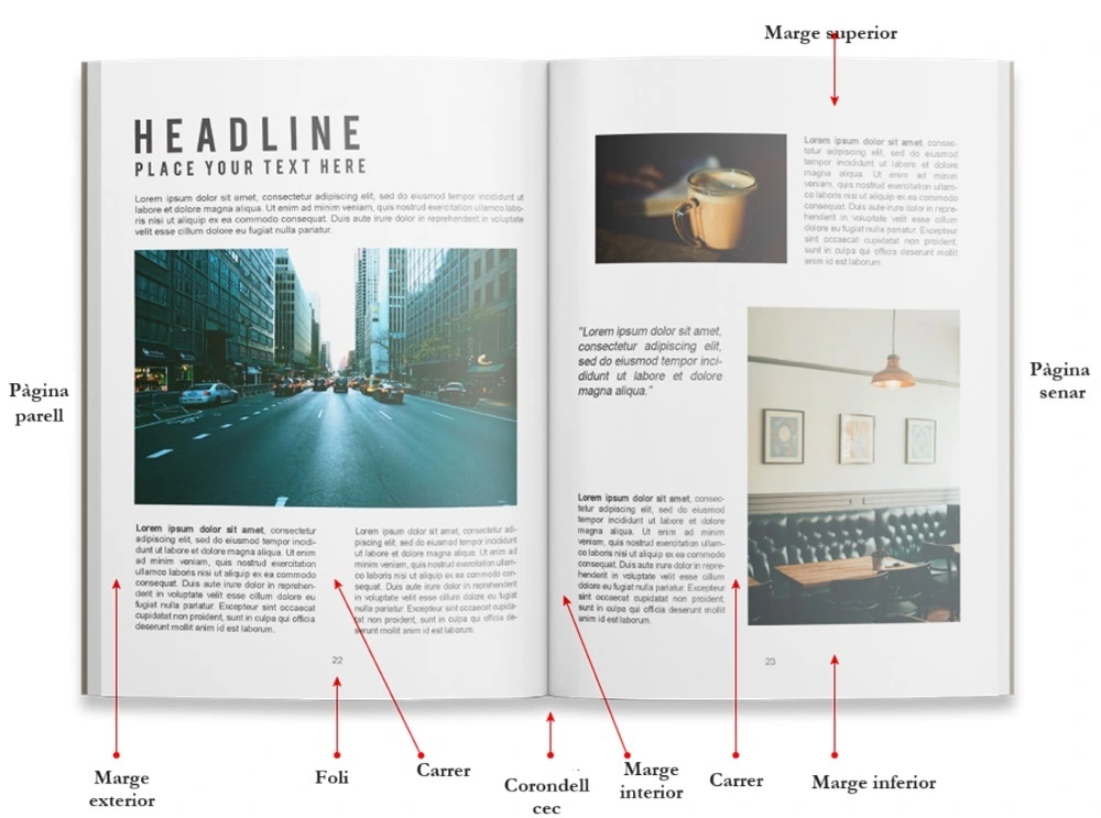 –Macrotipografia: –Macrotipografia: La macrotipografia atén la presentació dels elements més grans de la tipografia o circumdants a la caixa tipogràfica i els relaciona en la pàgina, entre parts del llibre i entre títols d’una col·lecció. Els ajustaments de les marcacions macrotipogràfiques s’han de fer en context, mai com a unitats aïllades. En assenyalar les seves parts, el seu ordre i els seus matisos és important establir una lògica clara entre els senyals. Cada element tipogràfic representa una categoria conceptual que indica al lector com llegir l’obra; per tant, els atributs visuals que els caracteritzen s’han d’aplicar de manera constant i concisa al llarg de tot el llibre. No poden canviar si el nivell d’importància i la naturalesa del que indiquen és el mateix. A partir de l’anàlisi del contingut s’han d’identificar: Quines són les categories amb què s’estructura el text. Per exemple, les parts en què es marca l’obra (els capítols, els subtítols, els paràgrafs o seccions, etc.), els senyals de referències (com citacions, glossilles i notes) o els elements aclaridors (peus d’il·lustració, llegendes de taules, etc.). Quants nivells té cada categoria. Per exemple, la quantitat de graus dels subtítols o les jerarquies de les llistes d’il·lustracions i gràfics, o la taula de contingut. Definides les necessitats del text, s’identifiquen les funcions organitzatives que els atributs gràfics poden assenyalar.
