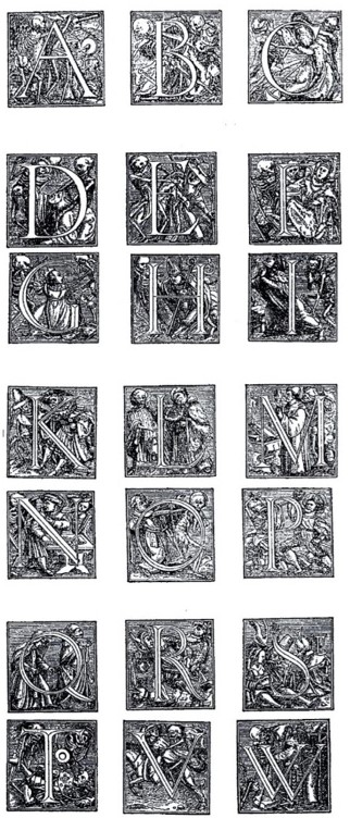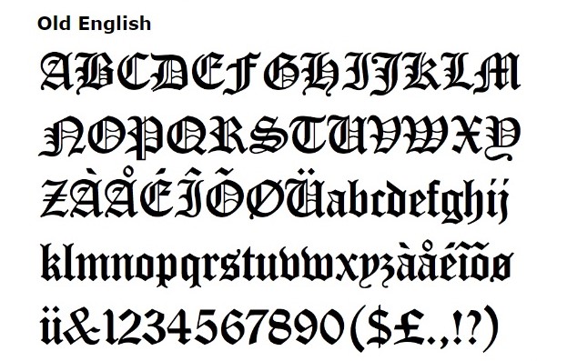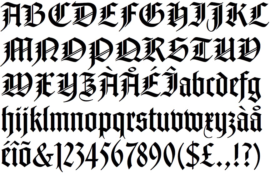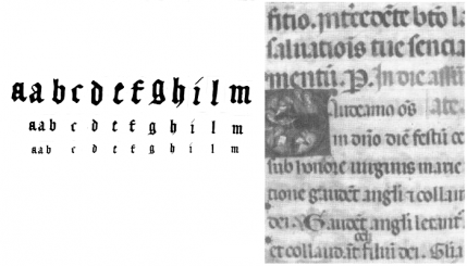 –Notre Dame: Dissenyada el 1993 per Karlgeorg Hoefer, Notre Dame forma part del programa de Linotype de 1990 “Tipografia abans de Gutenberg”, que va incloure el treball de dotze dissenyadors de tipus contemporanis presentant els estils que van aparèixer a través dels anys fins a l’aparició de la impremta . Aquesta tipografia va estar inspirada per l’estructura de les formes emprades en propòsits litúrgics durant els segles XIV i XV. Les tècniques digitals li van permetre afegir ornaments a les majúscules com els pics en forma de serra dels traços principals.