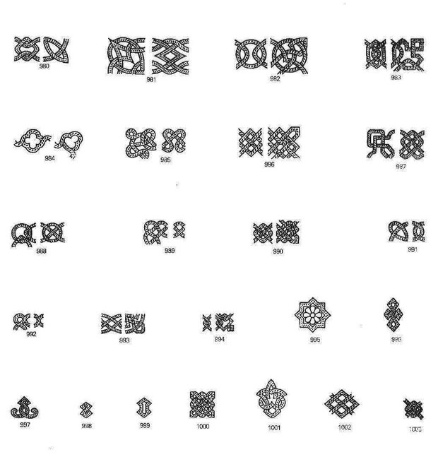 –Nus: 1. En el cosit, unió que es fa entre un fil amb si mateix o amb altres. 2. En l’art decoratiu dels manuscrits s’anomena així les decoracions on la línia s’entrellaça i podien ser de diversos tipus: ‘perseguint la seva pròpia cua’, ‘llengua lligada’, ‘Ma panache’, ‘Dragon A’, ‘nus del colom’, ‘colls entrellaçats’, ‘nus de Salomó’…3. Qualsevol dels elements que constitueixen un entrellaçat. NOTA: Pot ser emprat aïlladament com a element decoratiu.