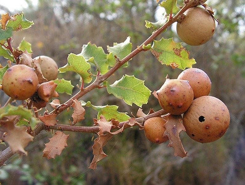 –Nou d’agalles: Excrescència tumoral produïda sobre la fulla d’alzina i altres vegetals després de la picada d’un insecte, utilitzada com a agent tànnic. L’excrescència pren la forma de nou, per això el nom. Va ser un dels materials més usats en la fabricació de la tinta utilitzada per a l’escriptura dels segles XVI al XVIII.