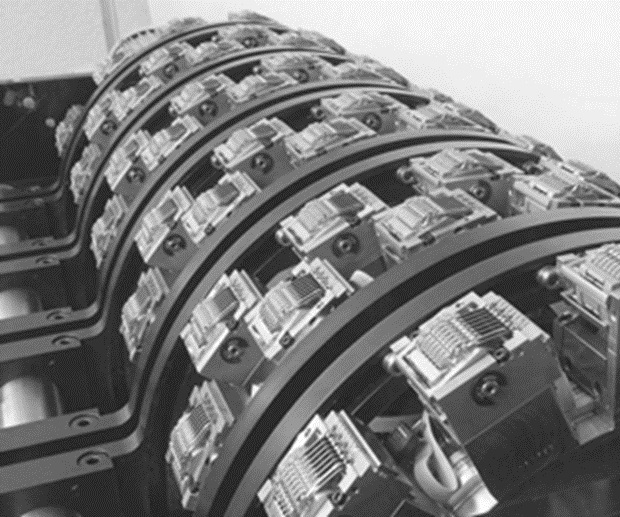 –Mandíbula davantera: Peça de la linotípia que acompanya la línia de matrius durant la fosa i bloqueja la sortida del metall a la funció de línies blanques. (cast. Quijada).