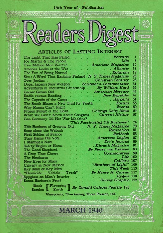 Las transacciones más importantes durante los últimoa años se las apuntaron entre nosotros los vendedores de números atrasados de “Reader’s Digest”, la revista más leída del mundo, 15.500.000 ejemplares por mes, en once idiomas se esparraman por nuestro planeta. Ignoro los que hace tres o cuatro añs llegaban a España; empero, sí que podré explicarles con cierto fundamento que el control de ejemplares usados de que hacía gala este mercado fue en todo momento de una discreta importancia. Recuerdo que sorprendió en gran manera la inflexible cotización que regía para la compra de números atrasados. Huelga decir que a mayor retrospectividad de los ejemplares, más cuantiosa se planteaba la tarifa. El precio, con todo, sufría variaciones inusitadas en algunos casos, lo que reforzaba una vez más la vieja creencia de que no hay regla sin excepción. Y comprenderán muy pronto a lo que voy si les explico que algunos números del primer año de la aparición de “Reader’s Digest” – 1941 – se vendieron por poco dinero a consecuencia de ciertas irrupciones del todo imprevistas en el mercado barcelonés. La edición argentina se permitió en más de una ocasión originar turbulentos descalabros, con lo que las listas a màquina de la cotización “oficial” no tuvieron más remedio que acusar el golpe y, maldiciendo al tío Paco, decretar la inminente rebaja.