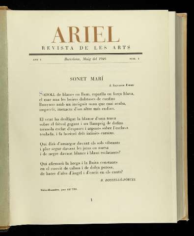 –Ariel: Revista de les arts. Barcelona, 1946-1951. Any 1, núm. 1 (maig 1946)-núm. 23 (des. 1951) Suspesa de jul. 1948 a juny 1950. Fundada per: Josep Palau i Fabre, [et al.] ; col·laboradors: S. Espriu, M. Manent, C. Riba, etc. ; il·lustradors: A. Clavé, M. Hugué, J. Sunyer, etc.