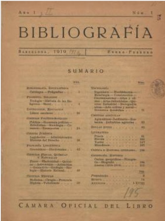 –Bibliografía, òrgan de la Cámara Oficial del Libro de Barcelona ( 1910-1920). 10 números digitalitzats. Col·legi professional creat l’any 1918 per les principals editorials catalanes per a la representació i gestió dels interessos professionals del llibre a Catalunya. Va desenvolupar una gran activitat fins a l’esclat de la Guerra Civil espanyola, l’any 1936. Durant aquest període va ser l’entitat que va instituir la Festa del Llibre i va publicar els primers catàlegs bibliogràfics catalans. L’any 1939, en acabar la Guerra Civil, va desaparèixer per ser annexada a l’Institut Nacional del Llibre Espanyol (INLE). L’any 1981 es va restaurar amb el nom de “Cambra del Llibre de Catalunya”, assumint les tasques de l’INLE, que aviat desapareixeria.