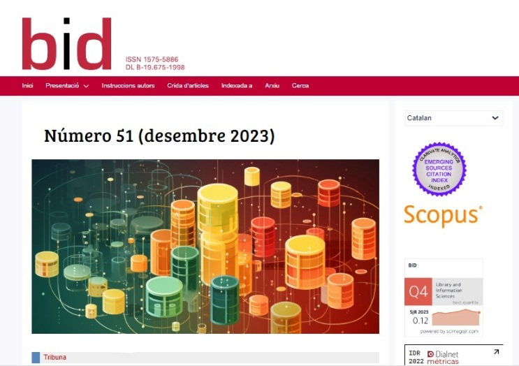 –BiD. Textos universitaris de biblioteconomia i documentació. Universitat de Barcelona/UOC, Barcelona. Bianual des de 1998. És una revista científica d’accés obert especialitzada en les ciències de la informació, documentació i la comunicació.