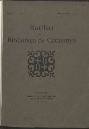 –Butlletí de la Biblioteca de Catalunya. Inst. d’Estudis Catalans/ Tip. L’Avenç, Barcelona, 1914-1986. Era el portaveu de l’esmentada Biblioteca, i contenia, demés de les notes i informacions corresponents (adquisicions, estadístiques, catàlegs de manuscrits, etc.), interessants treballs de bibliografia signats per Jaume Massó i Torrents, Jordi Rubió i Balaguer, Ramon d’Alòs Monner, Agustí Duran i Sanpere, Pere Bohigas i Balaguer, i altres.