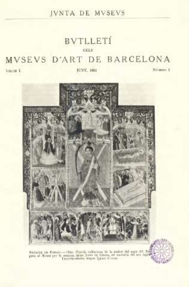 –Butlletí dels museus d’art de Barcelona (1931-1937).Junta de Museus/Imp. De la Casa de Caritat, Barcelona, 1931-1937. Publicació mensual dirigida per: Joaquim Folch i Torres ; col·laboradors: A. Duran i Sanpere, P. Bohigas i Tarragó, J.F. Ràfols, etc. A partir de 1932, l’impressor és: I.G. Seix i Barral Germans. Capçalera tipogràfica ; coberta il·lustrada, cada núm. amb fotografia diferent.