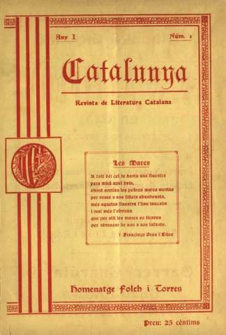 –Catalunya: revista literària quinzenal. Imp. I Lit. De Josep Cunill, Barcelona, 1903-1905. . Capçalera tip. Revista literària quinzenal, i després mensual, de Barcelona (1903-05). Dirigida per Josep Carner, en foren redactors molts dels seus amics (Bofill i Mates, Antoni Muntanyola, Roig i Raventós, etc).
