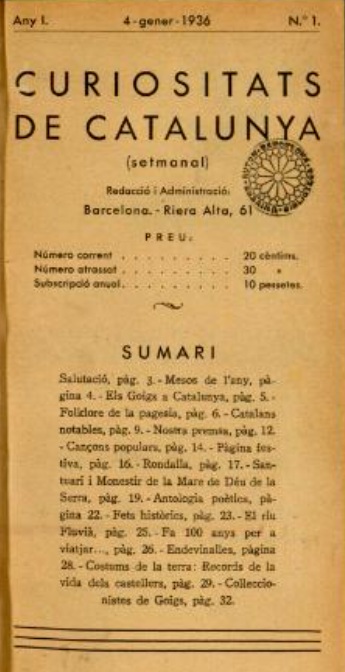 –Curiositats de Catalunya (1936-1937), Imp. Altés, Barcelona, Revista Setmanal, 92 números. Director Miquel Codina i Farré.
