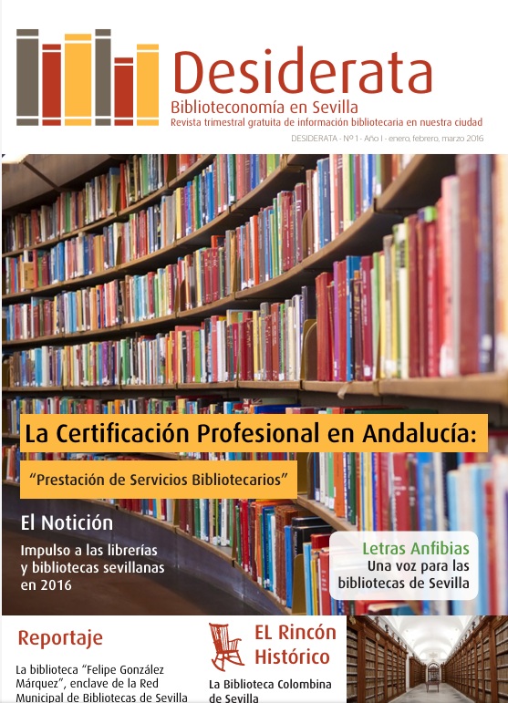 –Desiderata. Biblioteconomía en España. Edita Auxiliar de Biblioteca SLU, Sevilla. Des de l’’any 2016. “La Revista Desiderata nace con la misión de informar de una manera cercana sobre Biblioteconomía a nivel nacional (sin dejar de lado lo internacional), mediante un discurso despejado de tecnicismos y de abordajes complicados, con la finalidad de presentar el apasionante y atractivo mundo de las bibliotecas con un lenguaje sencillo buscando la máxima difusión”.