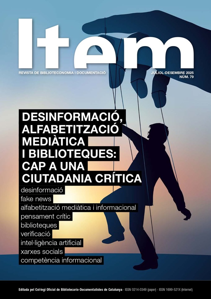–ITEM. Revista de Biblioteconomia i Documentació. Col·legi Oficial de Bibliotecaris-Documentalistes de Catalunya, Barcelona. És la publicació professional del Col·legi i recull treballs originals que expressen experiències, bones pràctiques i treballs de recerca relacionats amb tasques, equipaments i serveis d’informació i documentació. Es publica, cada sis mesos, des de l’any 1987.