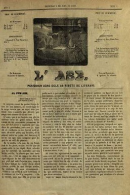 –L’Ase: periódich agre-dols ab ribets de literari. Surtirà un cop cada semmana Llibreria d’E. Puig/ Imp. V. Castaños, Barcelona, 1867. Any 1, núm. 1 (9 juny 1867)-any 1, núm. 26 (30 nov. 1867).Canvis en l’impressor