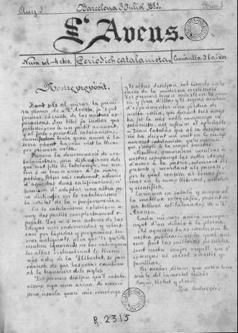 –L’Avens: literari, artístich, científich : revista mensual il·lustrada. Estampa Catalana de L. Obradors, Barcelona, 1881-1893. Dirigida per: Jaume Massó i Torrents, Ramon D. Perés, Joaquim Casas-Carbó ; col·laboradors: V. Almirall, S. Russiñol, P. Fabra, etc. ; il·lustradors: R. Casas, J. Pahissa, A. Mestres, etc. Canvis ortogràfics en el títol, a partir de 1891: L’Avenç Canvis en l’impressor. Els deu primers números velografiats (jul./des. 1881) Capçalera mixta ; a partir del núm. 7 (1882), tipogràfica.
