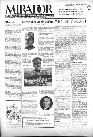 –Mirador: setmanari de literatura, art i política. La Neotípia, Barcelona, 1929-1937. Fundat per Amadeu Hurtado i dirigit per Manuel Brunet i Just Cabot ; dirigit, la 2a època per Artur Perucho ; il·lustracions d’Apa La 2a època, l’empresa està col.lectivitzada, imprès per Unió Gràfica. Capçalera tipogràfica. Descripció del recurs: 25 gener 2010
