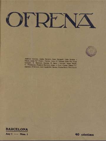 –Ofrena: revista catalana. Impr, d’Art, Barcelona, 1916-1918. Subtítol a la 2a època: orgue de “Nostra Parla”: agrupament de balears, catalans, rossellonesos i valencians. A partir del núm. 7, l’impressor és: Altés Impr. A la 2a època, redacció a: Barcelona, Ciutat de Mallorca, Perpinyà, València