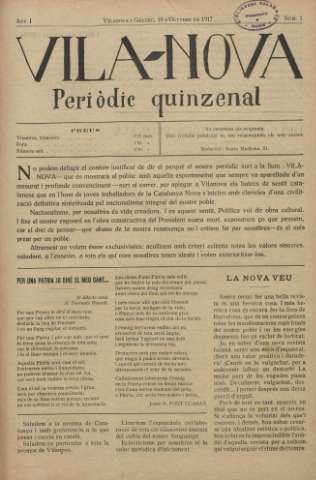 “Periòdic quinzenal”. 18 d’octubre de 1917. Una revista literària que pren l’herència de l’anterior [Themis] i que ens fa saber al primer número que “Vila-Nova surt al carrer per aplegar a Vilanova els batecs de sentit catalanesc. Vila-Nova tingué dues capçaleres diferents, tallades en fusta. Van sortir-ne 21 números, fins a setembre de 1918.
