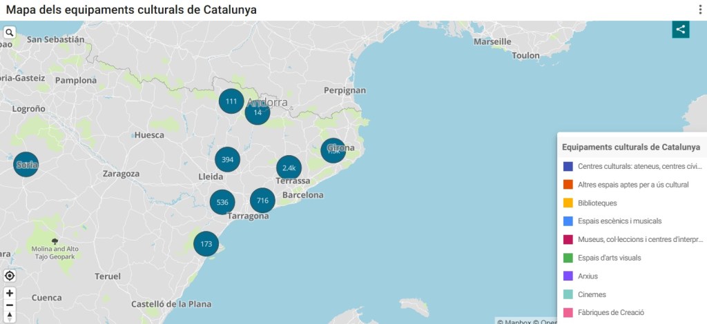 Per acabar crec que no estarà de més posar el Cercador d’Equipaments Culturals (Mapa) de la Generalitat de Catalunya, on trobareu, a més a més d’arxius, biblioteques i museus, Espais escènics i musicals, Espais d’arts visuals, Centres culturals i ateneus i Altres espais aptes per a ús cultural.