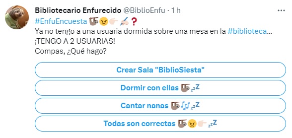BiblioSiesta: el Bibliotecario Enfurecido ( @BiblioEnfu ) de Twitter posa una enquesta per saber què ha de fer amb els usuaris que s’adormen. Una de les respostes és: “Crear una “BiblioSiesta”.