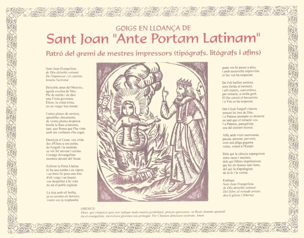Els impressors tenen, com a patró, des del segle XIX, a Sant Joan Ante Portam Latinam, quin martiri devien recordar la pietat dels nostres, cada vegada que ells elaboraven la tinta d’imprimir, la qual no es venia en el comerç del nostre país, abans del primer terç del segle XIX.