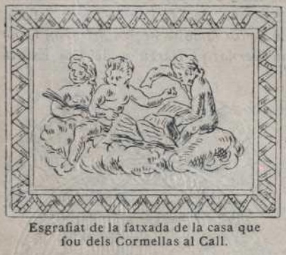 ( L’esgrafiat fou restaurat el 1966, i efectivament recorda l’existència de la impremta Cormellas, “oficina tipogràfica” que hi va ser del 1591 al 1670.)