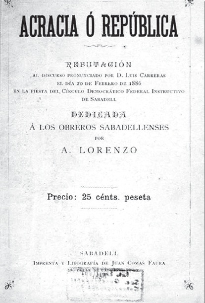 –Lorenzo Asperilla, Anselmo: (Toledo, 21 d’abril de 1841 – Barcelona, 30 de novembre de 1914) fou un dirigent i teòric anarquista espanyol. Treballà com a tipògraf i formà part del primer nucli internacionalista creat el 1868 per Giuseppe Fanelli, i fou el principal redactor de La Solidaridad (1870-71). Destacà en el Congrés Obrer de Barcelona de 1870, dins la tendència antipolítica, i fou elegit membre del consell federal de la Federació Regional Espanyola de l’AIT.