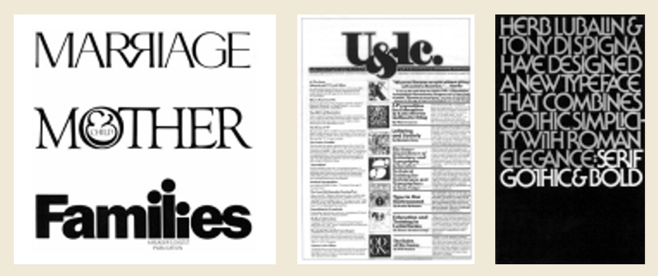 –Lubalin, Herb (New York, 1918-1981): Dissenyador de gran importància per les seves innovacions al camp de la tipografia. El seu treball va abastar el disseny editorial, el ‘packaging’, la creació d’alfabets i la publicitat. Fundador de l’empresa International Typeface Corporation (ITC) dedicada a crear alfabets per als sistemes de fotocomposició, novetat de la dècada 1970. A la dècada de 1960 es va produir un gran gir tecnològic en les arts gràfiques: els titulars, compostos fins aleshores amb tipus de metall, van passar a fer-se mitjançant reproduccions fotogràfiques d’alfabets. Lubalin va ser un dels que més audaçment va explotar les possibilitats de les noves tecnologies. Els seus dissenys juguen amb l’espaiat, la forma i la mida dels caràcters aconseguint peces de gran expressivitat i bellesa.