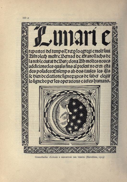 –Lunari: Calendari. Llibre concernent a les mutacions lunars. Els antics lunaris eren llibres d’endevinació usats principalment per la gent del camp. Amb ells creien saber els pronòstics del temps amb gran anticipació. És molt conegut el famós ‘Lunari Perpetu’, que encara perdura al nostre país.