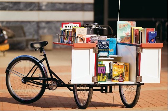 Bibliobicicleta: bicicleta amb una petita llibreria que volta per San Francisco oferint llibres. La bibliotecària d’una escola, Alícia Tapia, en el seu temps lliure , intenta una missió per difondre l’amor per la lectura. El coneixement dels llibres importants poden tenir influència sobre l’alfabetització i l’aprenentatge , per aquest motiu va començar remolcar una biblioteca en miniatura al voltant de San Francisco el 2013. Ella anomena a la seva creació Bibliobicicleta. I te un vlok per contactar amb ella i fer donacions: que també es diu Bibliobicicleta.